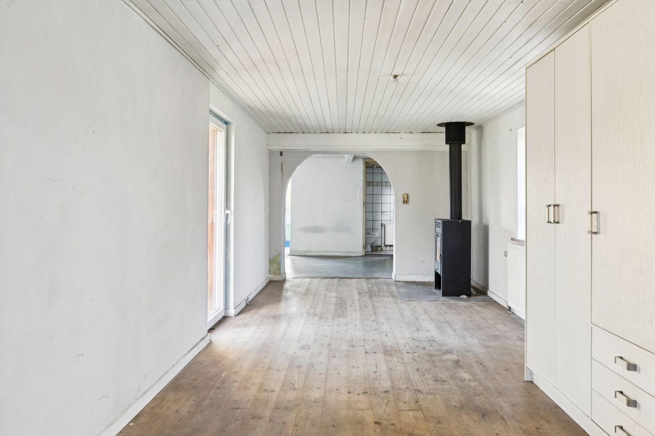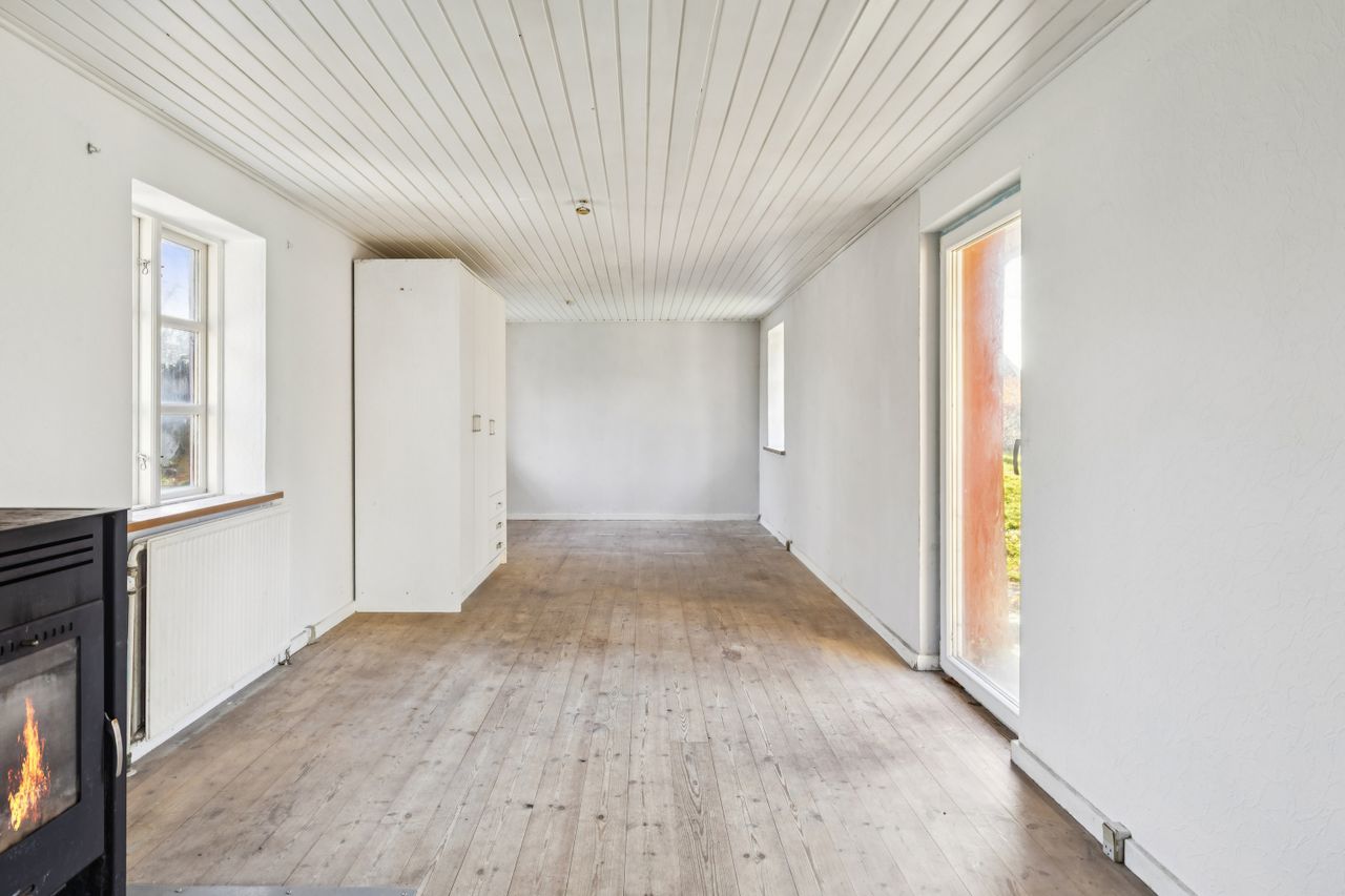 Indvendigt byder boligen på 87 m2 med en enkel og overskuelig planløsning: entré, et værelse, et brusebadeværelse samt en rummelig stue med åben forbindelse til køkkenet. Kvadratmeterne giver et solidt udgangspunkt for dig, der enten vil bygge videre eller tænke nyt, så boligen kan tilpasses netop dine behov og drømme.