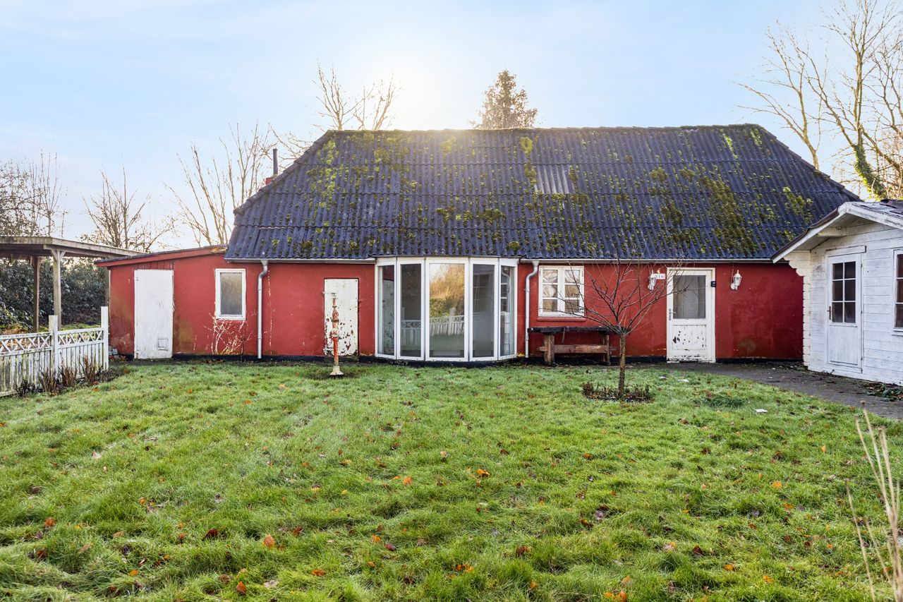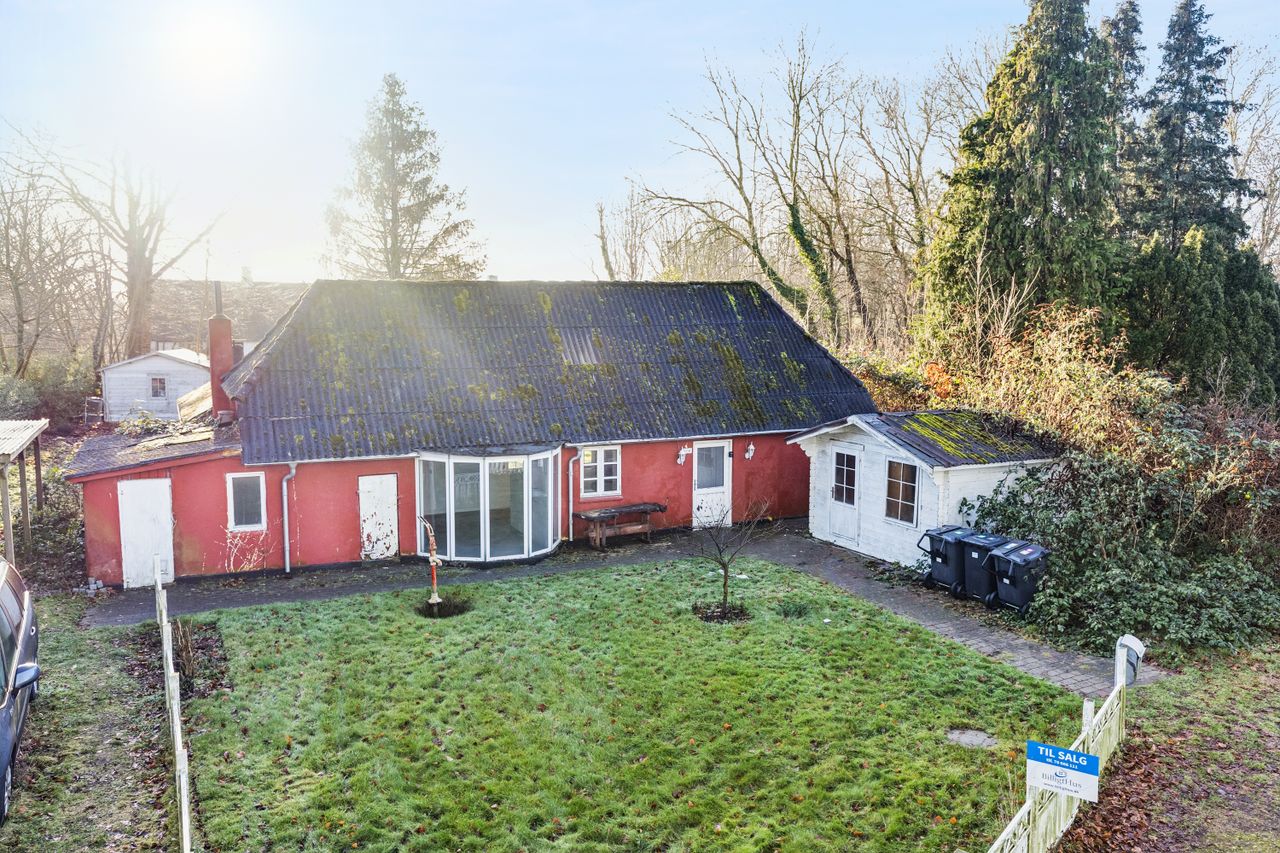 Ejendommen har stået her siden 1877 og ligger trygt placeret på en 851 m2 stor grund, hvor beplantningen lukker verden lidt ude og giver plads til ro, privatliv og et uforstyrret udeliv. Haven er grøn og levende med smådyr og fugle, der passerer frit forbi, og hvor sommerdagene naturligt leves udendørs. Samtidig er der plads til idéer og forandringer i både haven og de tilhørende udhuse, som oplagt egner sig til værksted, opbevaring eller kreative projekter.